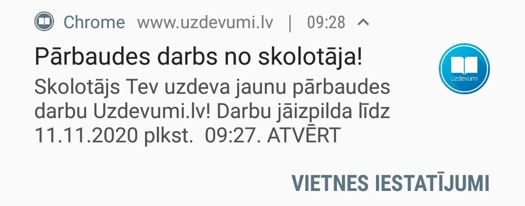 Plašajā informācijas daudzumā, kas ikdienā jāpatērē kā skolēniem, tā vecākiem, var pazust svarīgas ziņas no skolotāja, piemēram, par uzdotajiem mājasdarbiem. Aicinām skolēnus un vecākus pieteikties Uzdevumi.lv pārlūkprogrammas paziņojumiem, kas palīdzēs izsekot līdzi portālā uzdotajiem darbiem un atgādinās tos laicīgi izpildīt.