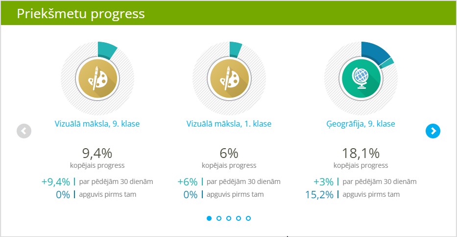 • Priekšmetu progress - parāda, cik % no katra priekšmeta savā klasē jau esi apguvis