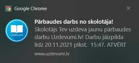 Atcerēties visu nav iespējams! Ikdienas ritmā bieži var piemirsties svarīga informācija, piemēram, par uzdotajiem mājasdarbiem. Lai milzīgajā datu apjomā spētu izsekot līdzi portālā uzdotajiem darbiem un varētu tos laicīgi izpildīt, aicinām pieteikties Uzdevumi.lv pārlūkprogrammas paziņojumiem!