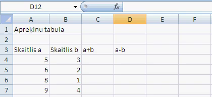 - ievada formulu = A4+B4 (šūnā norādīts, ka jāveic skaitļa a, kas atrodas kolonnā A, un skaitļa b, kas atrodas kolonnā B, saskaitīšana);