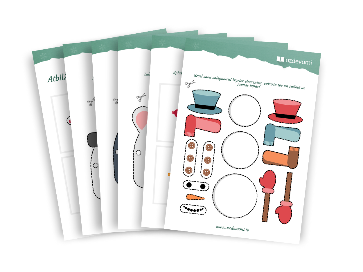 Dodies radošā ziemas piedzīvojumā! Izveido masku un pārtopi par sniegavīru, rūķi vai citu ziemas tēlu. Izveido savu sniegavīru, izgriežot un sakārtojot elementus, un izaicini sevi, atrodot atšķirības krāsainajos zīmējumos.