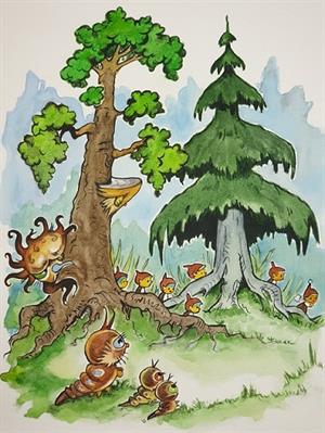Šajā attēlā redzamie koki un mošķi ir laimīgi.